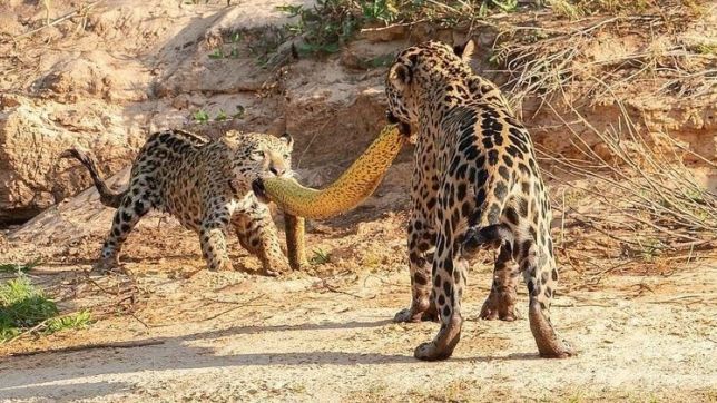 Nos últimos instantes de vida, uma sucuri-amarela (Eunectes notaeus) foi feita de "cabo de guerra" por uma mãe e um filhote de onça-pintada.