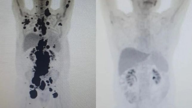 As duas imagens do Pet Scan (tomografia feita com um contraste especial ) (veja acima) representam “dois Paulos”: a da esquerda, o paciente que tinha como caminho único os cuidados paliativos, quando a alternativa é dar conforto, mas já sem expectativa de cura, e a da direita, um paciente com um organismo já sem tumores após o tratamento com CAR-T Cell.