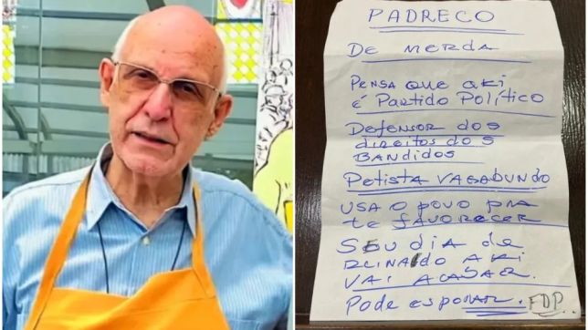A mensagem, deixada na porta da paróquia, na Zona Leste da capital, diz que "seu dia de reinado aqui vai acabar". O religioso também é xingado e chamado de "defensor dos direitos de bandidos" (veja a imagem do bilhete acima).
