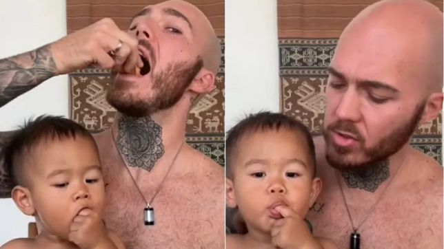 Em um vídeo publicado no TikTok, o homem segura seu filho no colo e corta um pedaço de testículo cru dizendo que o garoto é “selvagem” e que é “o prato favorito” dele.