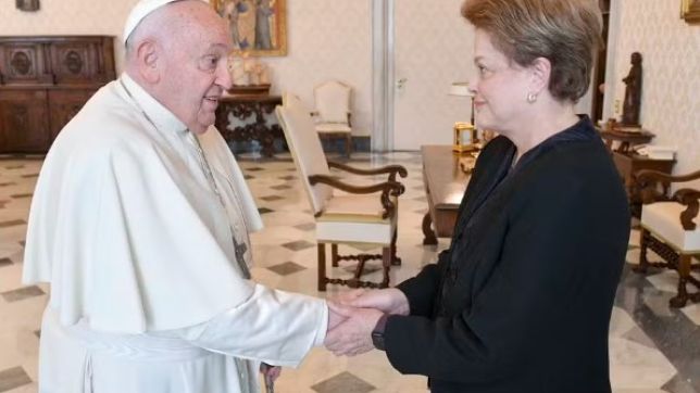 Segundo o Vaticano, a ex-presidente deu ao papa o livro “Theodoro Sampaio. Nos sertões e na cidade”, de Ademir Pereira dos Santos e recebeu de presente de Francisco a encíclica “Laudato si", a exortação apostólica “Laudate Deum” e uma escultura em bronze