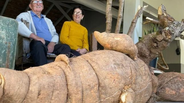 O produtor Otávio Hoeppner conta que precisou de ajuda para colher o pé de mandioca de 112 quilos que se desenvolveu no terreno que tem com a esposa, Wilma, em Pomerode, no Vale do Itajaí, em Santa Catarina. Ele e o jardineiro da propriedade vizinha levaram quatro horas para retirar toda a planta da terra, contou.