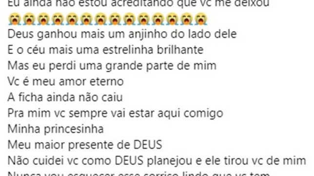 “Deus ganhou mais um anjinho do lado dele. E o céu mais uma estrelinha brilhante. Mas eu perdi uma grande parte de mim”, completou o pai de Isabela no desabafo nas redes sociais.