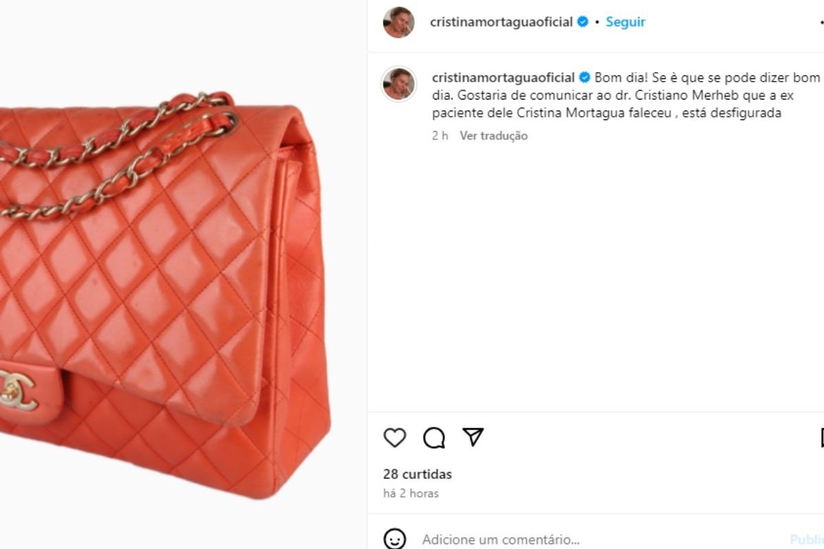 Seu velório será fechado, ela preferiu ser cremada. Seu espírito precisa descansar, lutou por toda a madrugada”. Em uma outra postagem, foi informado: “Bom dia! Se é que se pode dizer bom dia. Gostaria de comunicar ao dr. Cristiano Merheb que a ex-paciente dele, Cristina Mortágua, faleceu, está desfigurada”.