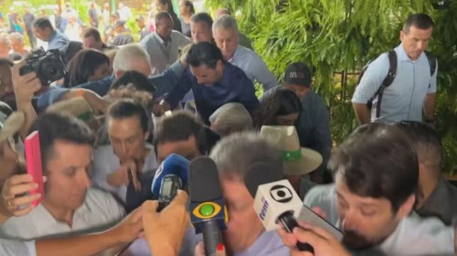 O governador participou da abertura em um dos quatro espaços montados para o evento e atendia jornalistas quando o piso do palanque de madeira cedeu. Várias pessoas que estavam próximas de Tarcísio caíram no buraco que se abriu.