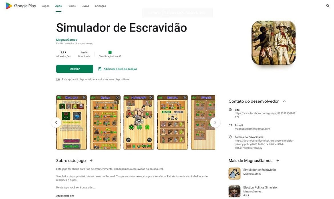 No dia 20 de abril de 2023, foi identificado um jogo mobile disponível na Google Play Store que desagradou e ofendeu milhões de pessoas. O jogo, intitulado Slavery Simulator, ou Simulador de Escravidão em português, permite que o jogador assuma o papel de um proprietário de pessoas escravizadas.