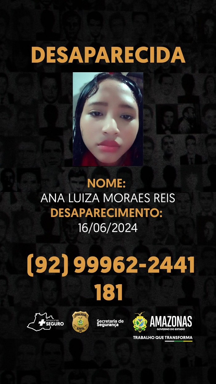 Ana Luiza Moraes Reis, 13, desapareceu no domingo (16/06), por volta das 18h30, após ser vista saindo da casa onde mora localizada na rua 10 de Julho, bairro Petrópolis, Zona Sul da capital. Desde a data mencionada, a adolescente não retornou e nem deu notícias aos familiares.