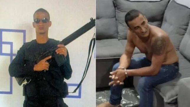 Jairo: com arma e roupa militar (à esquerda) e na hora da prisão em 2022