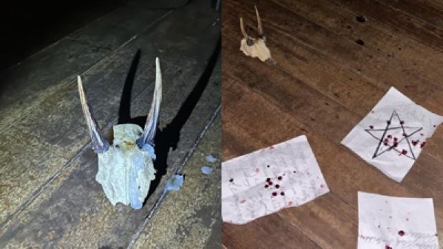 PM encontrou uma folha de papel com um pentagrama desenhado, com o número 666 escrito e com cruzes invertidas pintadas no papel, além de gotas de sangue e a palavra Satan