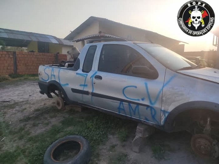 A guarnição foi acionada pela central de operações do 11° BPM, que haviam 5 criminosos furtando uma residência, realizando pichação da sigla (CV).