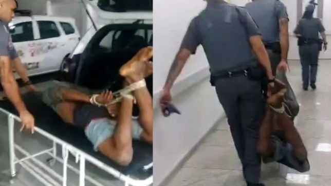 Foi pedido apoio para outra viatura e, ao todo, quatro PMs usaram uma corda para amarrá-lo pelas mãos e pelos pés.
