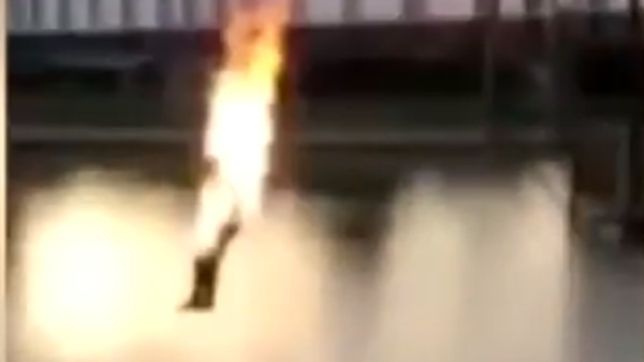 Nas imagens é possível ver não só o momento no qual os jovens enchem as roupas de gasolina, como também quando eles pulam de uma altura de pouco mais de seis metros.