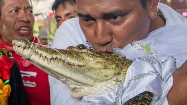 O prefeito de uma cidade do sul do México se casou com um jacaré vestido de noiva. O episódio inusitado faz parte de uma tradição indígena milenar. Os habitantes do local acreditam que o réptil seja uma divindade representante da Mãe Terra.