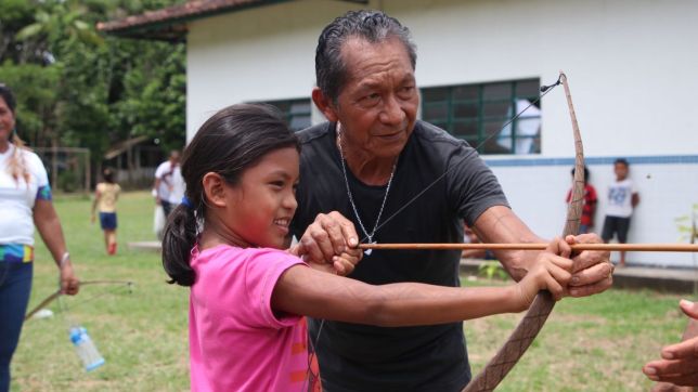 Criança indígena aprendendo a modalidade de arco e flecha com idoso indígena