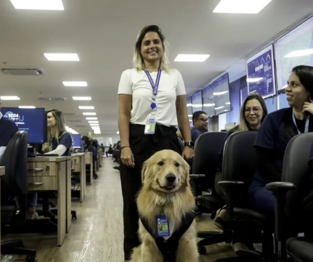 De crachá, Rudá 'bate ponto' como cão de suporte emocional na Secretaria de Saúde do estado
