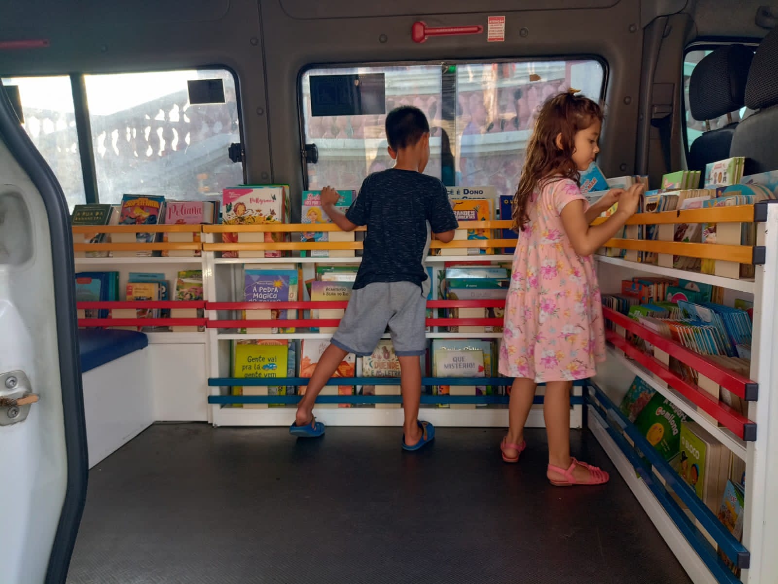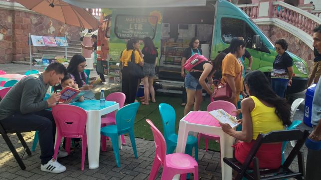 A biblioteca conta com veículos adaptados, com acervo de 1200 obras de literatura infantil e infantojuvenil