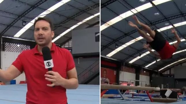 "Será que eu ainda consigo fazer alguma coisa?", questionou, dizendo ainda que estava "matando saudades" da ginástica. E para a surpresa de todos, o repórter da Globo conseguiu dar dois mortais ao vivo.