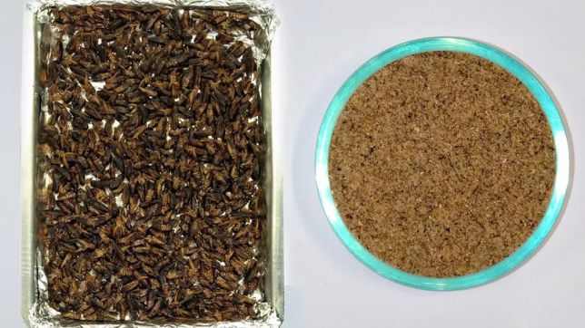 À direita, a farinha de grilo, desenvolvida em parceria com pesquisadores alemães; à esquerda, insetos em processo de secagem