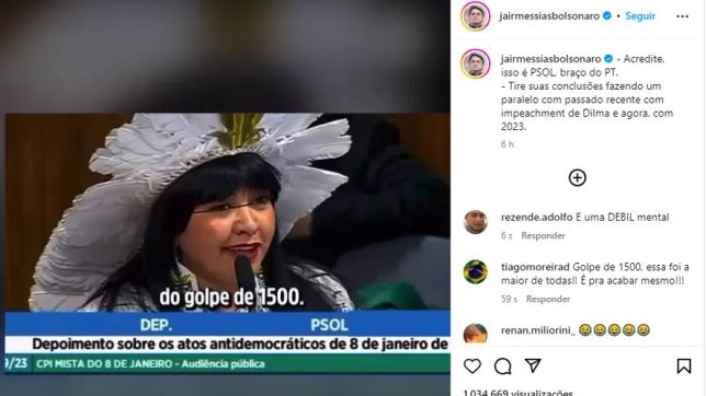 A bancada da federação PSOL-Rede saiu em defesa da deputada Célia Xakriabá, que foi alvo de uma publicação de Jair Bolsonaro por uma fala sua durante a CPI mista dos Atos Golpistas. No post, o ex-presidente ironiza a parlamentar por dizer que “não tivemos oportunidade de instaurar uma CPMI do Golpe de 1500”, em alusão à chegada dos portugueses ao Brasil.