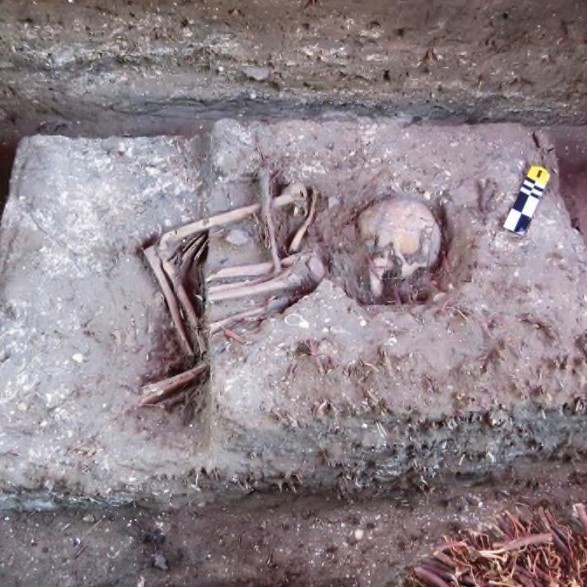Os dois primeiros esqueletos na área das obras foram descobertos em 2020. Ambos estavam calcados em fragmentos cerâmicos em meio a camadas de concha do sambaqui.