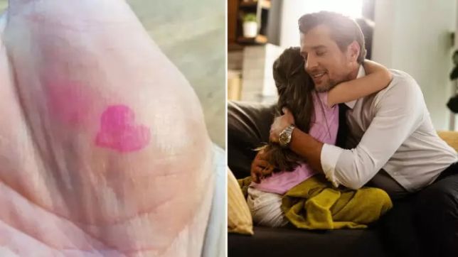Foi então que ela teve uma ideia brilhante: criar o “botão do abraço”.“Este pequeno coração na minha mão é chamado de ‘botão do abraço’. Desde que minha mulher morreu, no ano passado, minha filha odeia ficar longe de mim. A professora dela desenha o coração em nossas mãos sempre que eu a deixo na escola e, toda vez que a gente apertar, o botão envia um abraço ao outro”, contou o pai.