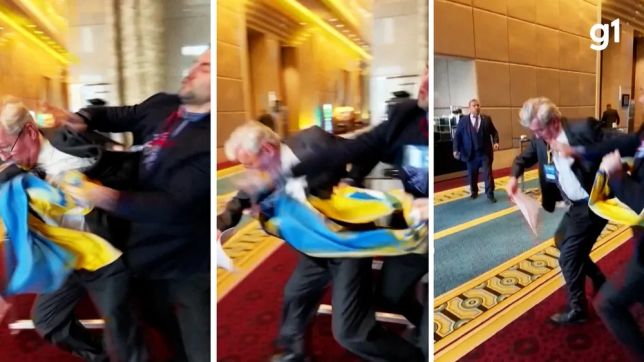 No início do mesmo dia, alguns representantes da delegação ucraniana brigaram com oficiais de segurança que tentavam afastá-los enquanto faziam um protesto.