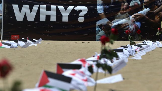 As areias de Copacabana foram cobertas por 120 mortalhas que representavam, segundo o fundador da ONG Rio de Paz, Antônio Carlos Costa, o número aproximado de crianças palestinas que morrem diariamente em Gaza. A manifestação foi organizada pela ONG que estendeu ainda uma faixa com a pergunta Why?, Porquê? em inglês. As mortalhas brancas estavam manchadas de vermelho. Ao lado de cada uma tinha uma bandeira da Palestina e, em algumas, rosas vermelhas.