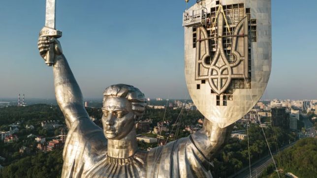 No domingo (6), o governo ucraniano substituiu o símbolo soviético do martelo e da foice por um tridente – o brasão ucraniano – no escudo do monumento que domina o horizonte da capital, a Mãe Pátria.