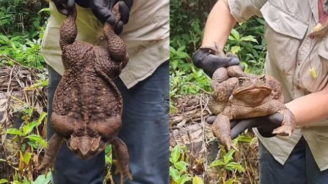 Os sapos-cururus foram levados para Queensland em 1935, para ajudar a controlar uma praga de besouros. Teve, no entanto, consequências devastadoras para outras espécies e se espalhou sem controle pela região. O sapo foi retirado do parque pelos guardas-florestais para ser sacrificado. Ele será pesado da forma correta, estudado e, depois de empalhado, enviado para o Museu de Queensland.