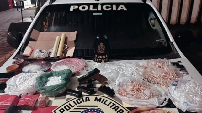 Os policiais foram até a residência e encontraram outras quatro pessoas. Dentro do imóvel, foram encontradas 950 pedras pequenas e uma pedra bruta de crack, 510 porções de cocaína, além de três tijolos de maconha e mais três porções a granel da droga. Os policiais também acharam R$ 3,2 mil em espécie e uma pistola 9mm, com três carregadores e 42 cartuchos íntegros, escondida na gaveta de um quarto.