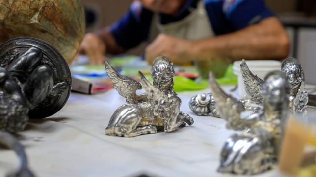Em outra dependência, profissionais se debruçam no trabalho de restauro de esculturas de metal, madeira, pedras, gesso, louças e elementos artísticos integrados à arquitetura, entre os quais do Teatro Amazonas.