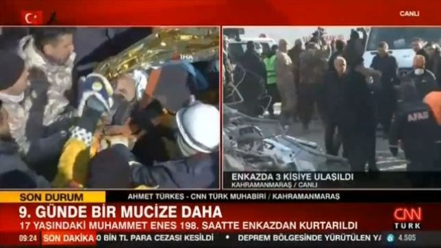 A emissora CNN baseada na Turquia informou ainda que, pouco depois, um jovem de 18 anos, identificado como Muhammed Cafer, foi encontrado com vida em Adiyaman.Outro resgate havia sido realizado na Turquia, 183 horas após o tremor. Em Hatay, socorristas retiraram dos destroços um homem de 67 anos chamado Huseyin Berber.Apesar de cada vez mais difícil, equipes de resgate conseguiram retirar sobreviventes dos escombros de cidades inteiras que ficaram em ruínas uma semana após o tremor de magnitude 7,8.