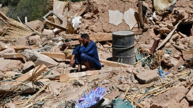 Homem chora sobre os escombros de uma casa em Tikht, sudoeste do Marrocos, em 10 de setembro de 2023