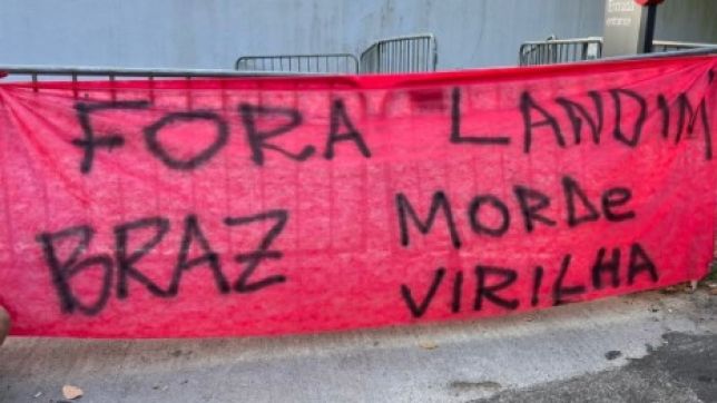 Uma faixa foi colada na porta do CT com críticas ao presidente Rodolfo Landim e ao vice-presidente de futebol do Flamengo, Marcos Braz.