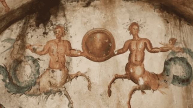 No ano passado, arqueólogos localizaram uma tumba de 2.200 anos decorada com murais impressionantes, incluindo pinturas de um cão de três cabeças, centauros e outras criaturas.