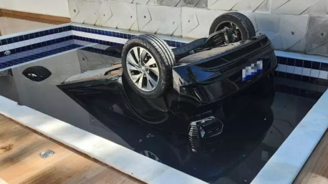 Ao tentar estacionar na garagem, a condutora perdeu o controle na subida e o veículo caiu na piscina. As duas ocupantes do banco da frente conseguiram sair do carro pelas janelas.