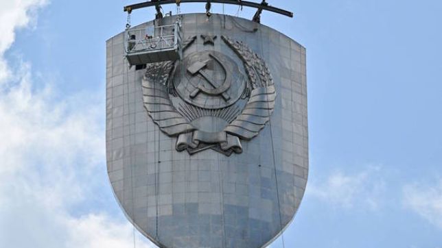 Uma equipe de operários da Ucrânia iniciou, neste domingo (30), a remoção de um brasão da antiga União Soviética — um símbolo do comunismo — do escudo da Pátria Mãe, um monumento histórico de 102 m de altura localizado em Kiev, a capital do país