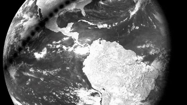 A Universidade de Wisconsin, nos Estados Unidos, divulgou uma composição inédita de 21 imagens de satélite, registradas entre 16h30 e 19h50, mostrando o rastro da sombra da lua durante o eclipse solar total do dia 8 de abril. Esse fenômeno acontece sempre que a Lua se posiciona exatamente entre o Sol e a Terra, fazendo uma sombra.