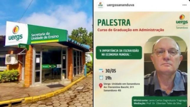 A Universidade Federal do Rio Grande do Sul (UERGS) de Sananduva compartilhou nesta semana, em seu Instagram oficial, a palestra chamada “A importância da escravidão na economia mundial.” A postagem causou péssima repercussão diante do título notadamente racista, o que levou a instituição excluir o informativo e soltar uma nota de esclarecimento.