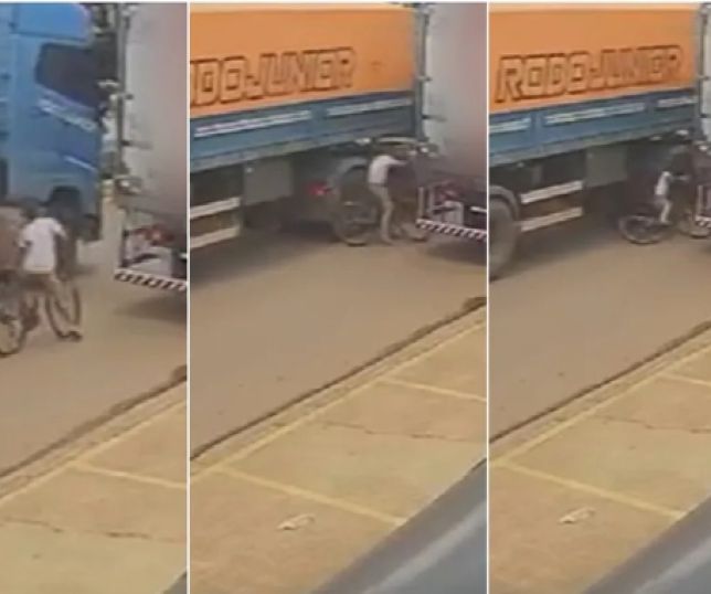 Ciclista cai em avenida e por um triz não vai parar debaixo de caminhão. VEJA VÍDEO