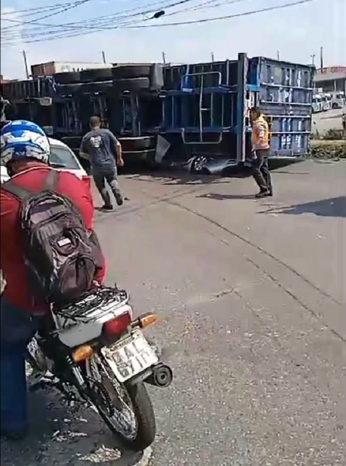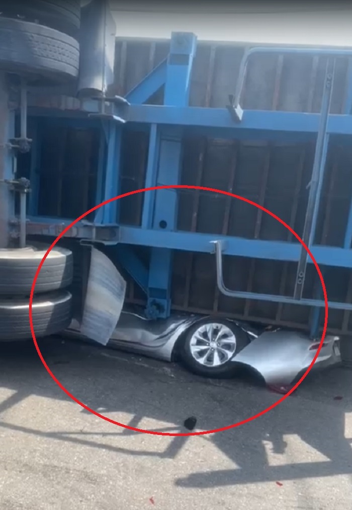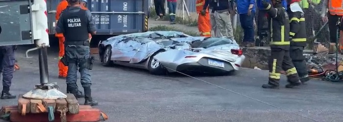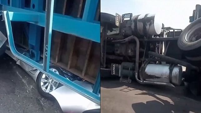 Nos vídeos o container da carreta tombada aparecem totalmente em cima do carro e não dá para verificar se quem está dentro do carro de pequeno porte, está vivou o morto por esmagamento.