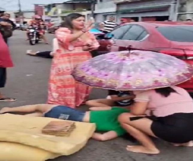 A luta corporal só chega ao fim quando o travesti que levou a pior fica caído e desacordado na calçada, enquanto o opositor, de vestido branco, é arrastado por um homem que seria seu namorado.