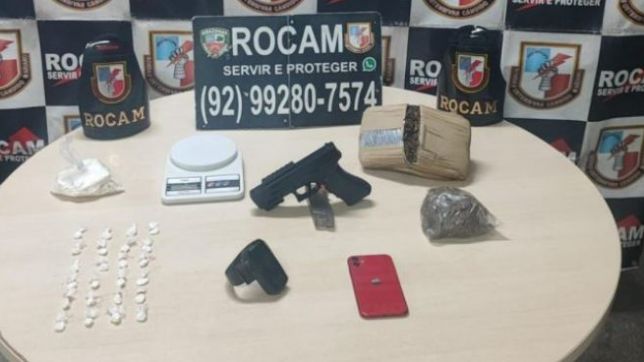 Uma ação da Ronda Ostensiva Cândido Mariano (Rocam) resultou na apreensão de drogas, um simulacro de arma de fogo, uma balança de precisão, um celular e uma tornozeleira eletrônica rompida, na noite de sexta-feira (10), no bairro Praça 14 de Janeiro, Zona Sul de Manaus.