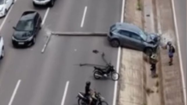 Um veículo modelo Polo perdeu o controle da direção e colidiu com um poste no canteiro central, provocando a queda da estrutura e a interdição parcial da pista.