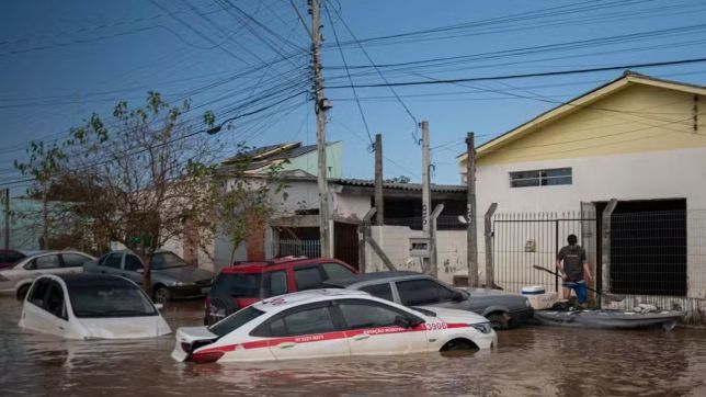Carros submersos durante as enchentes no Rio Grande do Sul