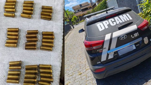 Durante as buscas, os agentes localizaram e apreenderam quatro munições intactas de calibre .38, da marca CBC, além de 44 estojos deflagrados do mesmo calibre, indicando possível uso anterior da arma.