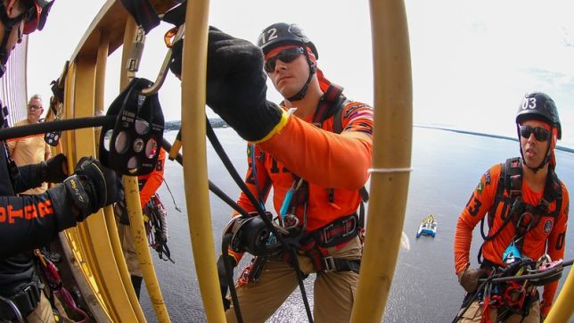 Militares do Corpo de Bombeiros simulam resgate de vítimas durante treinamento na ponte Phelippe Daou
