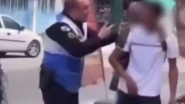 Durante a agressão, o jovem não reage, apenas balança a cabeça, retira o celular da cintura e começa a mexer no aparelho.