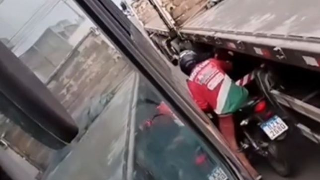 Em determinado momento, a lateral do caminhão chega a puxar a motocicleta, fazendo o condutor perder o equilíbrio. Motoristas que vinham logo atrás começam um buzinaço desesperado para alertar o caminhoneiro, que consegue parar a tempo. Por milagre, o motociclista não foi esmagado.