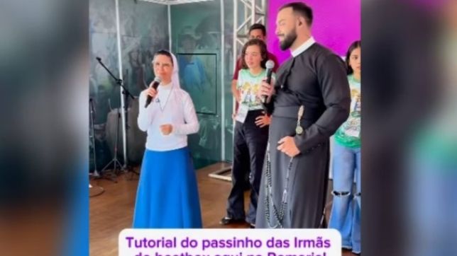 Após viralizar nas redes sociais dançando ao som de um beatbox, a freira Marisa de Paula fez um tutorial do “passinho” durante a Romaria do Divino Pai Eterno, em Trindade, na região metropolitana da capital goiana. Ao lado do frei Giovane Bastos, a irmã ensinou a dança com uma música sobre “vocação”.